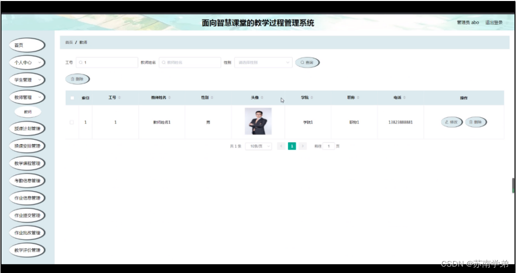教师管理,在教师管理页面可以对索引,工号,教师姓名,性别,头像,学院,职称,电话等信息进行修改和删除操作,如图5-5所示。