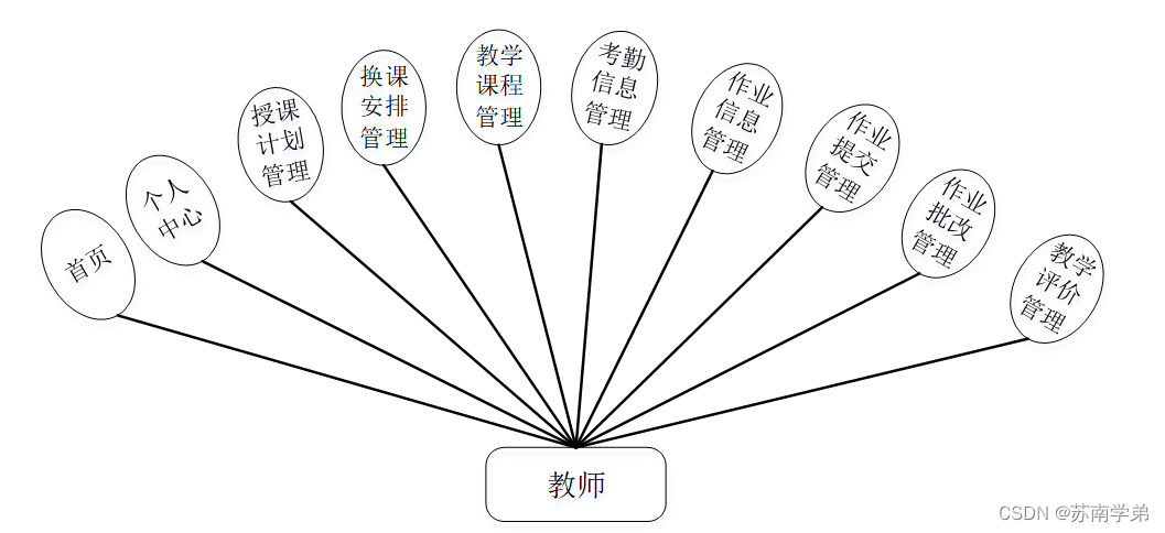 教师进入系统后能对首页,个人中心,授课计划管理,换课安排管理,教学课程管理,考勤信息管理,作业信息管理,作业提交管理,作业批改管理,教学评价管理等功能进行教师范围内操作。教师用例图如图3-2所示。