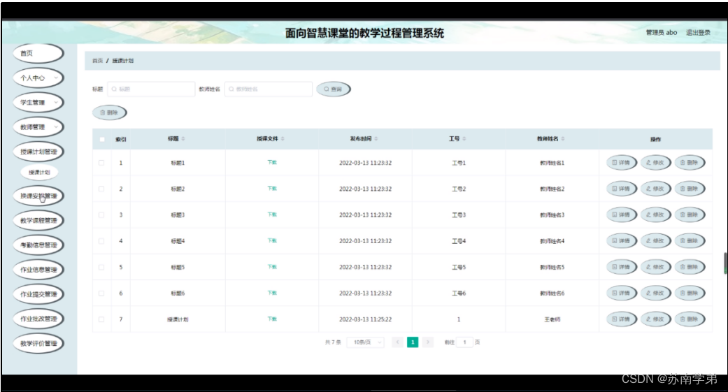 授课计划管理,在授课计划管理页面可以对索引,标题,授课文件,发布时间,工号,教师姓名等内容进行详情,修改或删除等操作,如图5-12所示。