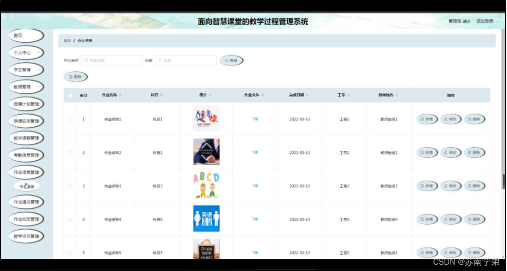 作业信息管理,在作业信息管理页面可以对索引,作业名称,科目,图片,作业文件,完成日期,工号,教师姓名等内容进行详情,修改和删除操作;如图5-9所示。
