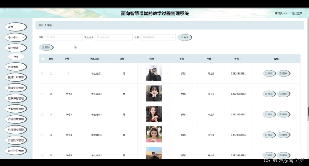 学生管理,在学生管理页面可以对索引,学号,学生姓名,性别,头像,学院,专业,手机等内容进行修改和删除等操作,如图5-4所示。