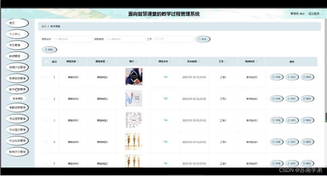 教学课程管理,在教学课程管理页面可以对索引,课程名称,课程类型,图片,课程文件,发布时间,工号,教师姓名等内容进行详情,修改和删除操作,如图5-7所示。