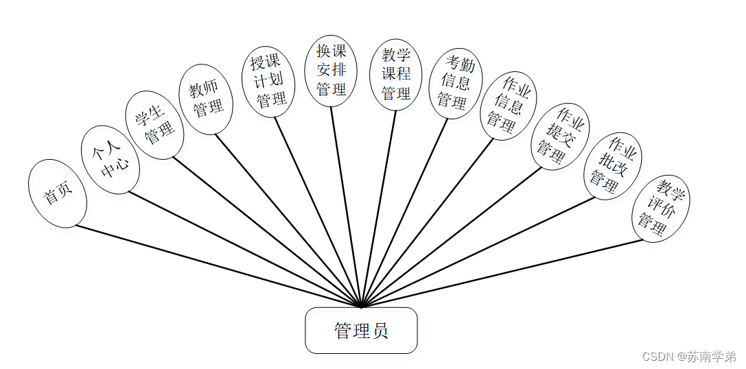系统用户角色可分为三种权限:管理员,学生和教师。管理员可以执行所有的操作,管理员可以对学生,教师进行信息编辑,同时可对系统应该具备的功能进行分析。可以对首页,个人中心,学生管理,教师管理,授课计划管理,换课安排管理,教学课程管理,考勤信息管理,作业信息管理,作业提交管理,作业批改管理,教学评价管理等功能进行操作。管理员用例图如图3-1所示。