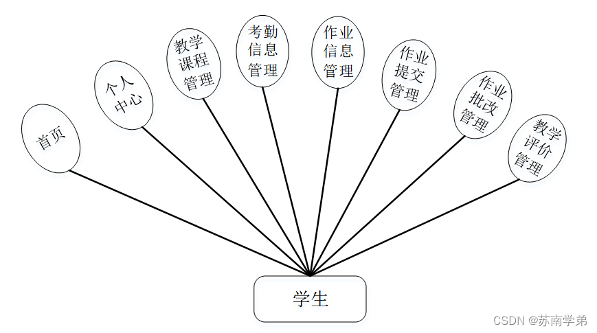 学生进入系统后能对首页,个人中心,教学课程管理,考勤信息管理,作业信息管理,作业提交管理,作业批改管理,教学评价管理等功能进行用户范围内操作。学生用例图如图3-3所示。