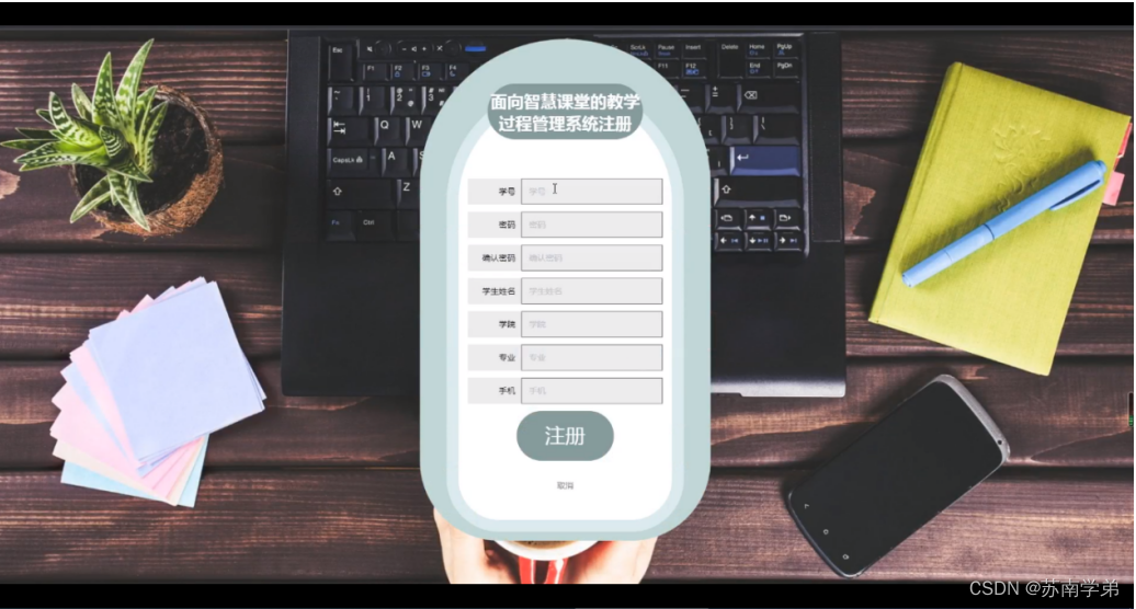 学生注册,在学生注册页面通过填写学号,密码,确认密码,学生姓名,学院,专业,手机等内容进行注册操作,如图5-2所示。