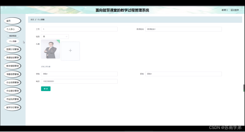 个人中心,在个人中心页面通过填写工号,教师姓名,性别,头像,学院,职称,电话等内容进行个人信息修改操作,如图5-11所示。
