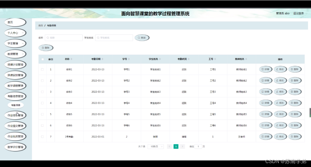 考勤信息管理,在考勤信息管理页面可以对索引,名称,考勤日期,学号,学生姓名,考勤状况,工号,教师姓名等内容进行详情,修改和删除操作;如图5-8所示。