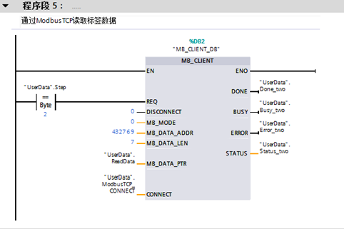 程序段5:步骤2时,对读卡器的输出区进行写参数,读写器上输出区地址为16#8000,对应PLC地址为400001+32768,即432769,本次需要进行读标签数据操作,本例中读取标签的地址为4,寄存器数量为4的数据,并且获取输出区的系统信息、操作状态、成功标签。因此读取的长度设为7,从MB_DATA_PTR处获取读取的数据。
