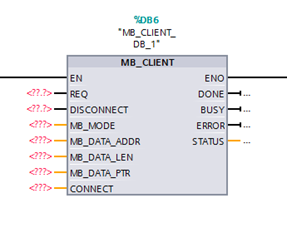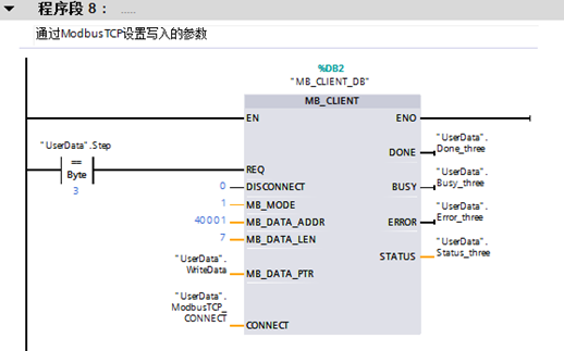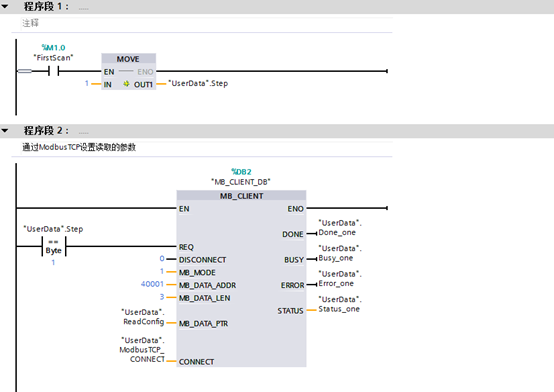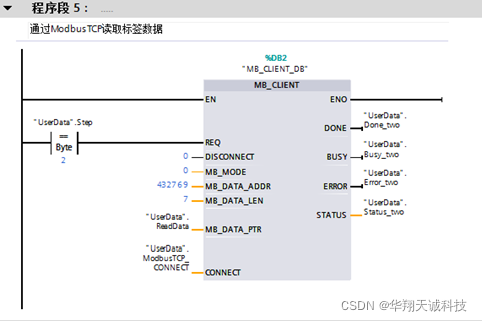 本程序使用MB_CLIENT模块进行modbus tcp通信,如下图所示: