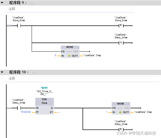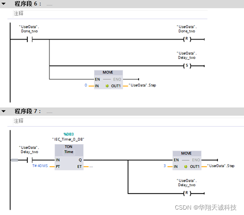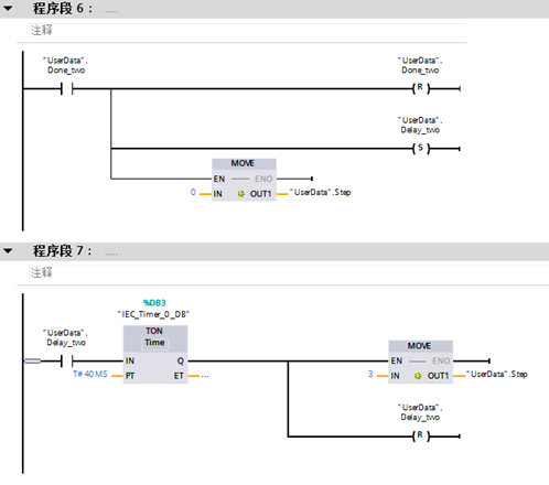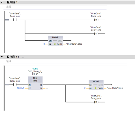 程序段4:本例中在执行完步骤1后延时40ms,可根据实际情况进行调整设置。延时结束后执行步骤2。
