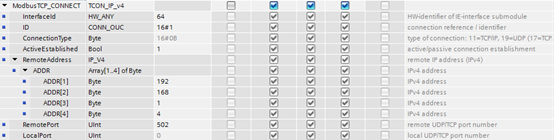 该管脚需要输入类型为TCON_IP_v4类型的变量,本例中创建ModbusTCP_CONNECT作为输入CONNECT管脚的变量,该变量下包含的变量如下: