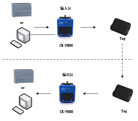 读卡器内部分数据输入区和数据输出区,PLC向读卡器输入区写入相关的数据和操作指令,读卡器执行读写器指令后,把执行指令的结果存储到读卡器的输出区。