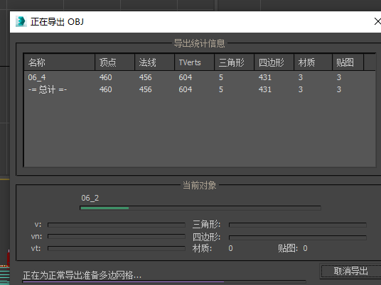 d、导出obj,此时可以设置导出时的参数,比如纹理格式、是否优化以及缩放比例等。