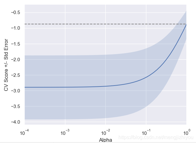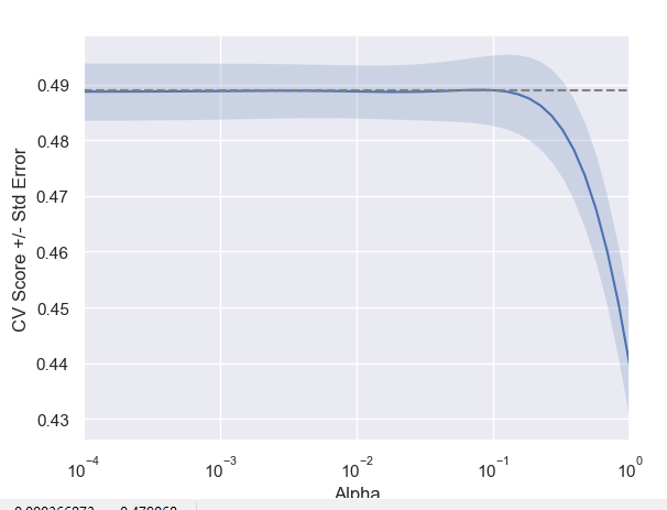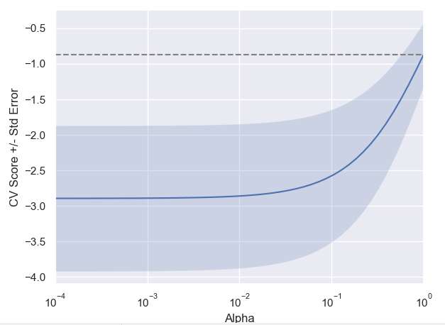 def display_plot(cv_scores, cv_scores_std):fig = plt.figure()ax = fig.add_subplot(1, 1, 1)ax.plot(alpha_space, cv_scores)std_error = cv_scores_std / np.sqrt(10)ax.fill_between(alpha_space, cv_scores + std_error, cv_scores - std_error, alpha=0.2)ax.set_ylabel('CV Score +/- Std Error')ax.set_xlabel('Alpha')ax.axhline(np.max(cv_scores), linestyle='--', color='.5')ax.set_xlim([alpha_space[0], alpha_space[-1]])ax.set_xscale('log')plt.show()# prepare data