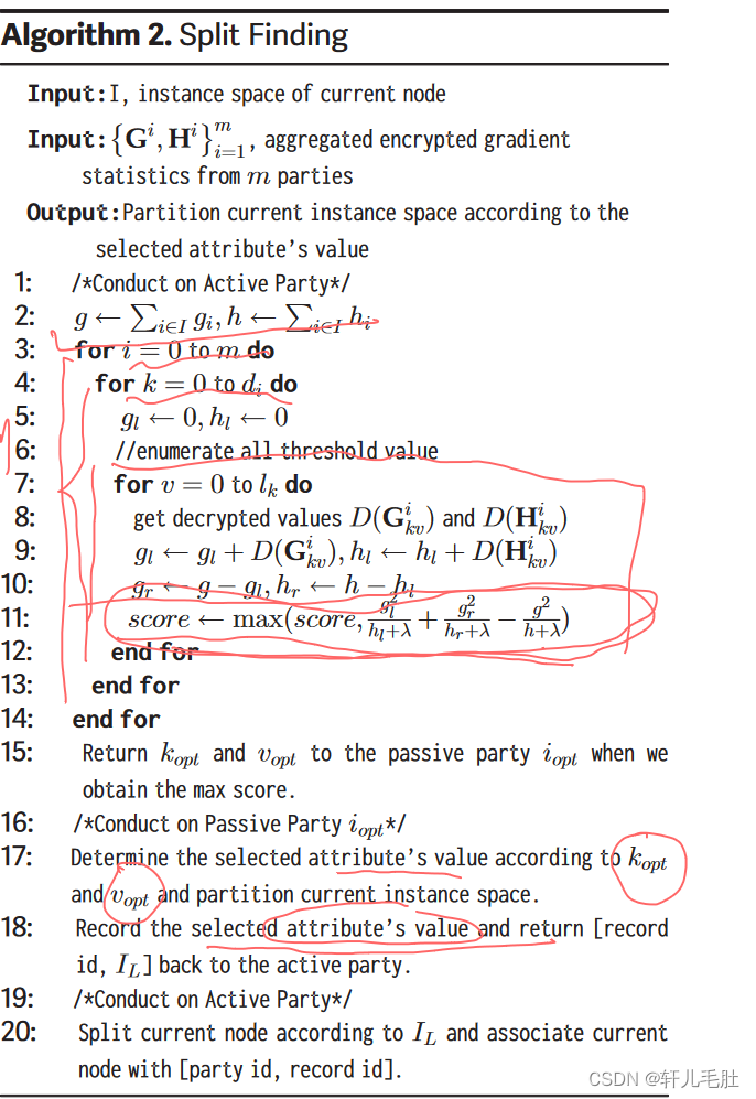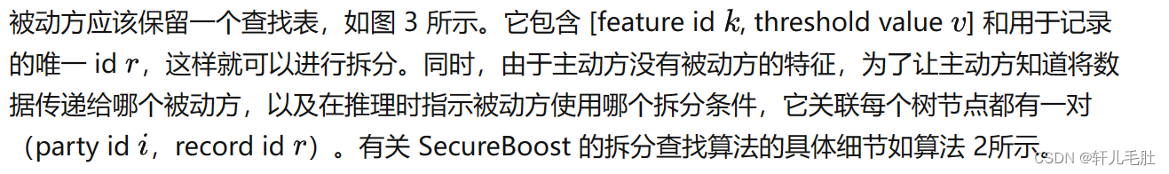 (1)party2分裂第一个结点,即根结点。这是SecureBoost中为了防止数据泄漏的所做的一个操作(重点),意思就是说,第一个结点是只有标签的一方分裂的(主动方),这样的话,即使你根据后面的分裂结果,最多只能反解到第二层,根结点你是解不出来的,相当于做了一个差分隐私;