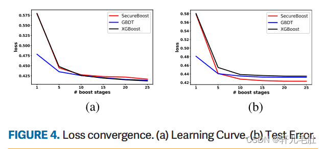首先,我们对收敛速度感兴趣。我们将 SecureBoost 的收敛行为与非联邦算法比较,包括 GBDT 和 XGBoost。从图 4 可以看出,SecureBoost 在训练数据集上显示出与其他非联邦方法相似的学习曲线,甚至在测试数据集上的表现略好于其他方法。此外,SecureBoost 的训练和测试损失的收敛行为与 GBDT 和 XGBoost 非常相似。(我没搞懂,我觉得收敛速度应该和XGBoost一样的啊)