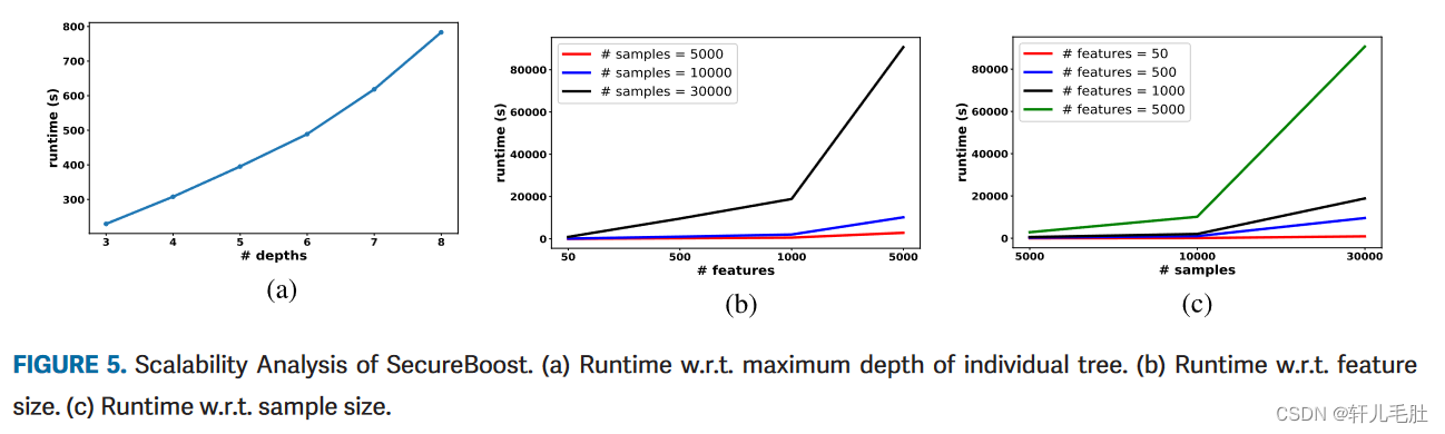 最后,我们研究了数据大小对我们提出的系统运行时间的影响。我们通过求点积对特征进行增广。我们将单个回归树的最大深度固定为 3,并改变 {50, 500, 1000, 5000} 中的特征数和 {5000, 10000, 30000} 中的样本数。我们比较了运行时间,以研究每个变体如何影响算法的效率。我们对图 5 (b) 和图 5 (c) 进行了类似的观察,这意味着样本数和特征数对运行时间的贡献相同。此外,我们可以看到我们提出的框架即使在相对大的数据下也能很好地扩展。