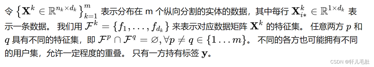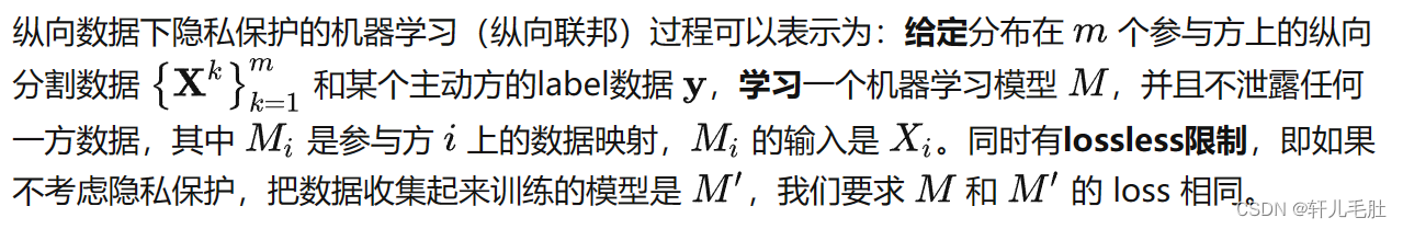 我们的目标是让各方共同构建预测模型,同时保护各方不将数据信息泄露给其他方。 与大多数现有的隐私保护数据挖掘和机器学习工作相比,我们设置的复杂性显着增加。 与横向联邦不同,纵向联邦设置需要更复杂的机制来分解每一方的损失函数。 此外,由于只有一个数据提供者拥有标签信息,我们需要提出一种安全协议来指导学习过程,而不是在各方之间明确共享标签信息。 最后,数据机密性和隐私问题防止各方暴露自己的用户。 因此,实体对齐也应该以足够安全的方式进行。
