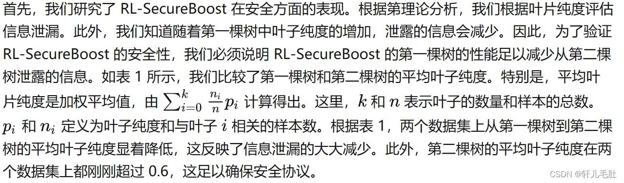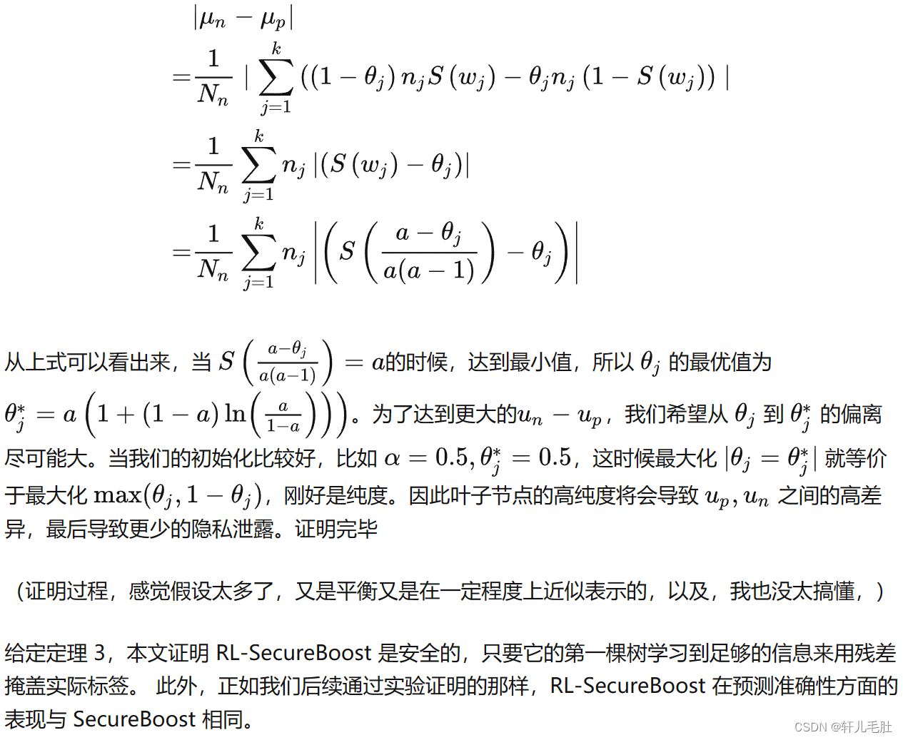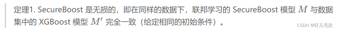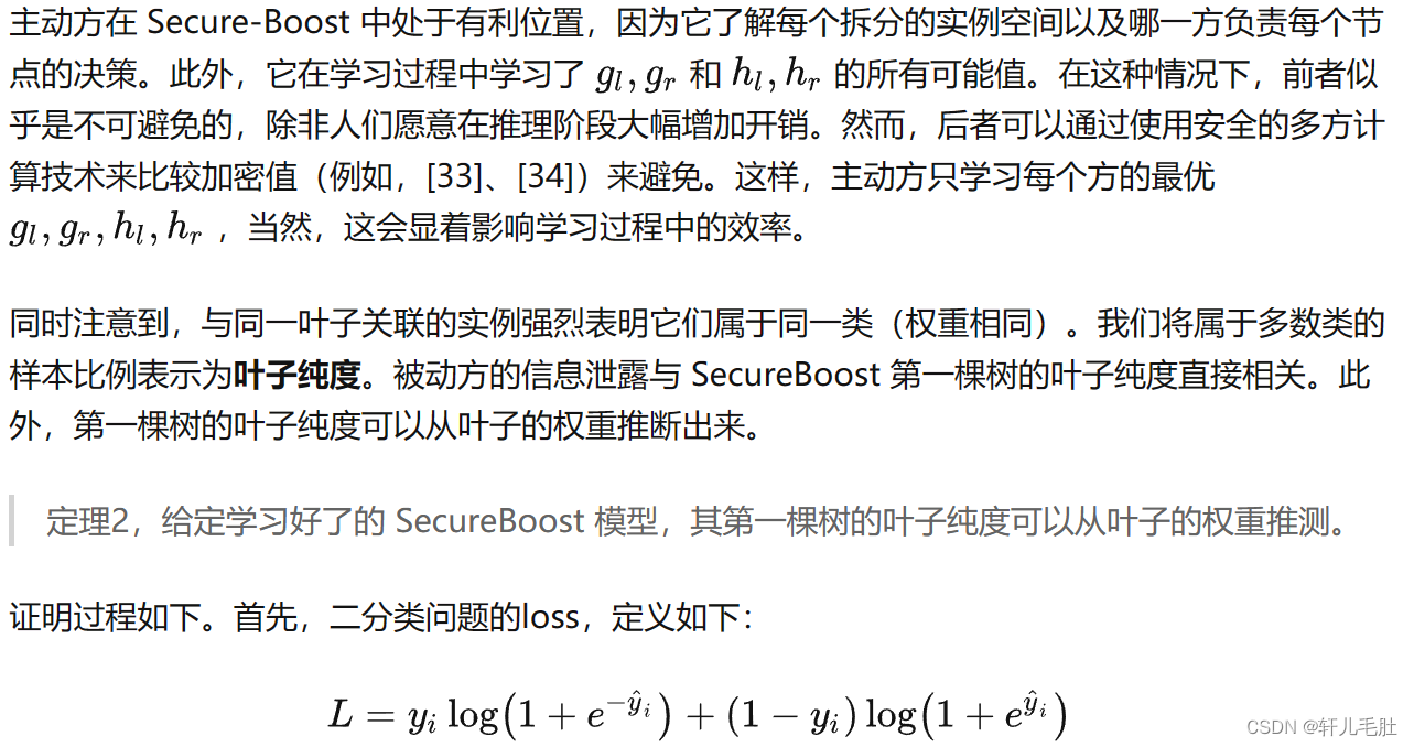 所谓的证明过程其实就是把 Paillier 同态加密的性质又放过来了一遍。又由于同态加密不像加噪声的机制一样,本身就是不会对数据造成影响,因此很显然,SecureBoost 是无损的。