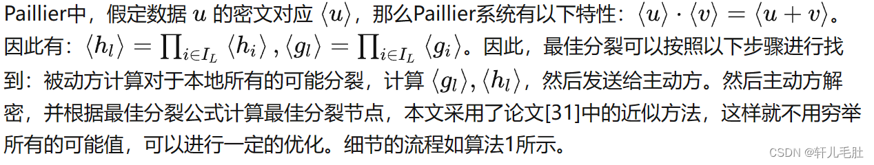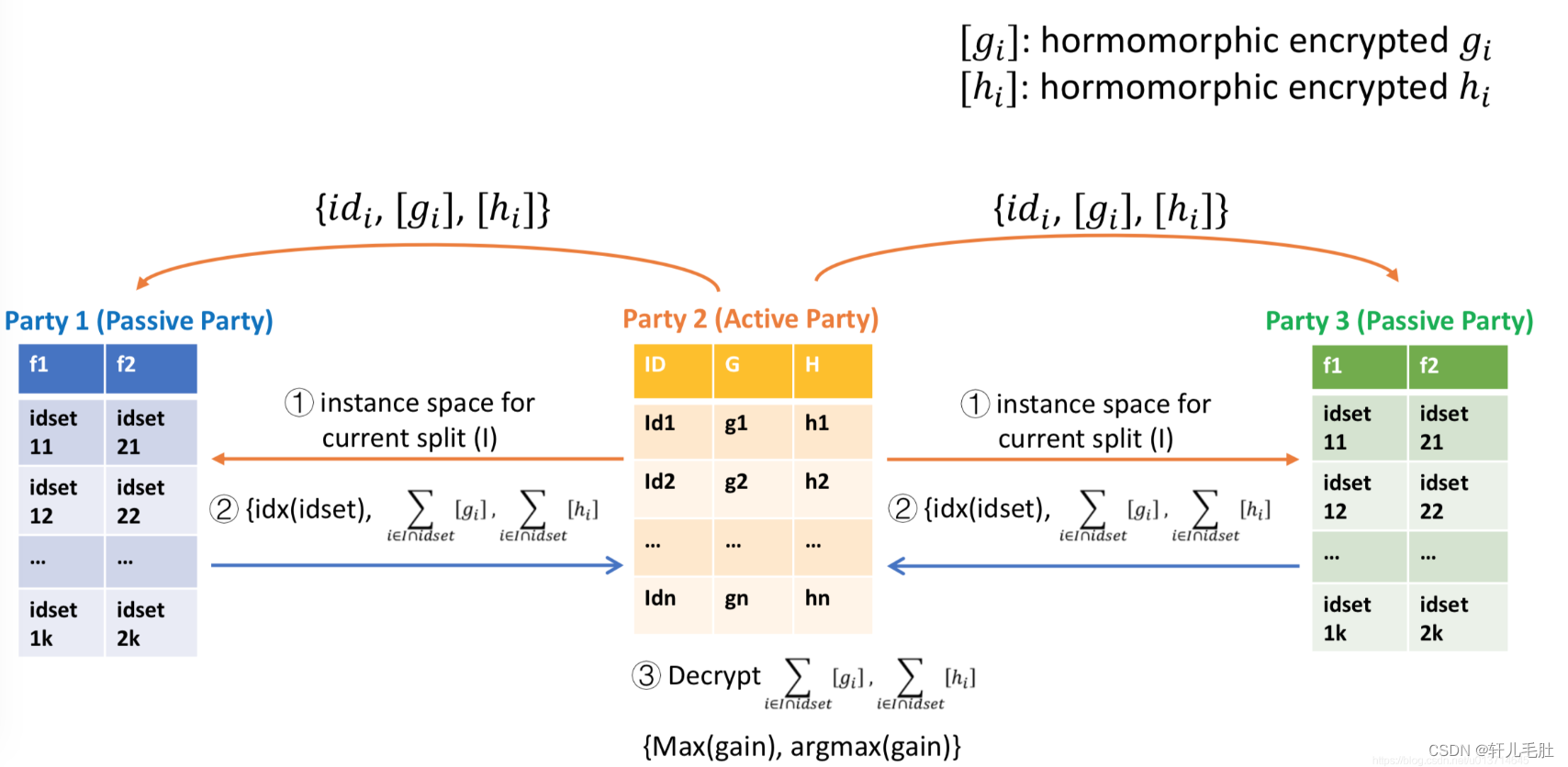 (2)party2分裂根结点后,将一阶导数g1和二阶导数g2经过经过同态加密,传给party1,了解同态加密的性质可知,知道加密后的g1和h1,他们加密后再相加的结果等于他们先相加再加密的结果。一阶梯度的和 and二阶梯度的和传过来之后,party1就可以计算loss和gain了,就可以训练了。party1分裂之后,把自己分裂所得的一阶导数和二阶导数经过加密之后传给party2,这样就实现了active party和passive party的通信;