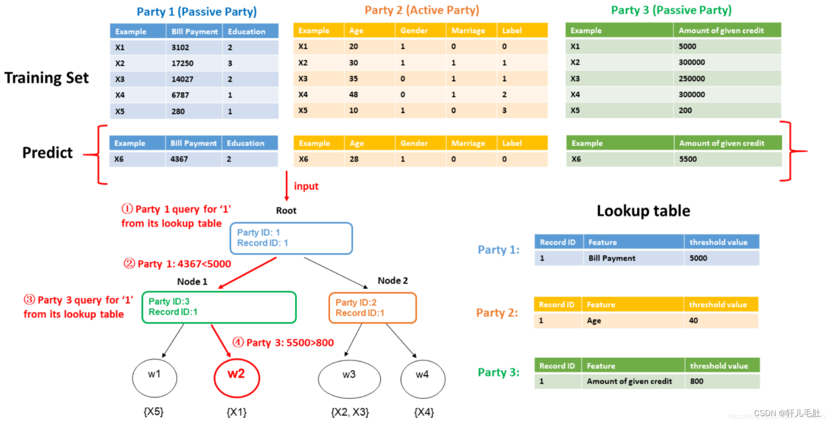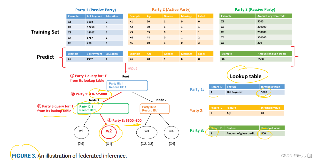 本节描述了如何使用学习模型(分布在各方之间)对新实例进行分类,即使要分类的实例的特征是私有的并且分布在各方之间。由于每一方都知道自己的特征,但对其他方一无所知,因此我们需要一个安全的分布式推理协议来根据做出的决定来控制从一方到另一方的传递。为了说明推理过程,我们考虑一个具有三方的系统,如图 3 所示。具体而言,第一方是主动方,它收集的信息包括用户的每月账单支付、教育以及标签,用户X6 是否做过按时付款。乙方和丙方为被动方,分别持有年龄、性别、婚姻状况和授信额度等特征。假设我们希望预测用户X6 是否会按时付款,那么所有参与方都必须协作进行预测。整个过程由主动方协调。从根开始,通过参考记录[party id:1,record id:1],主动方知道party 1持有根节点,从而要求party 1从其查找表中检索相应的属性Bill Payment基于记录 id 1。由于分类属性是账单支付,并且参与方 1 知道用户 X6 的账单支付是 4367,小于阈值 5000,所以它决定它应该向下移动到它的左子节点节点1. 然后,主动方引用节点1关联的记录[party id:3,record id:1],要求3方进行同样的操作。这个过程一直持续到到达叶子为止。