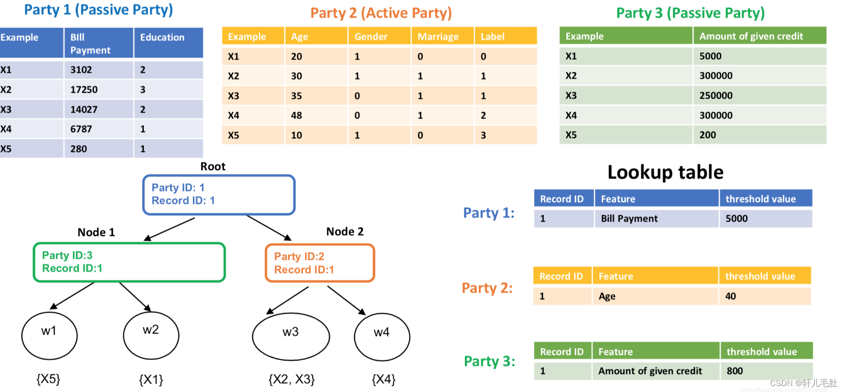 从整体上看,整颗树的结构如上图,实质上这也是主动方手里掌握的结构,但是除了自己的结点,对于其他的结点,他只知道party id(该谁分裂),Record ID(该谁的第几个特征分裂),并不知道具体的含义(重点)。