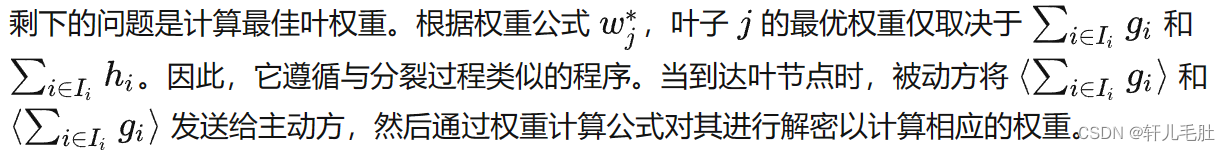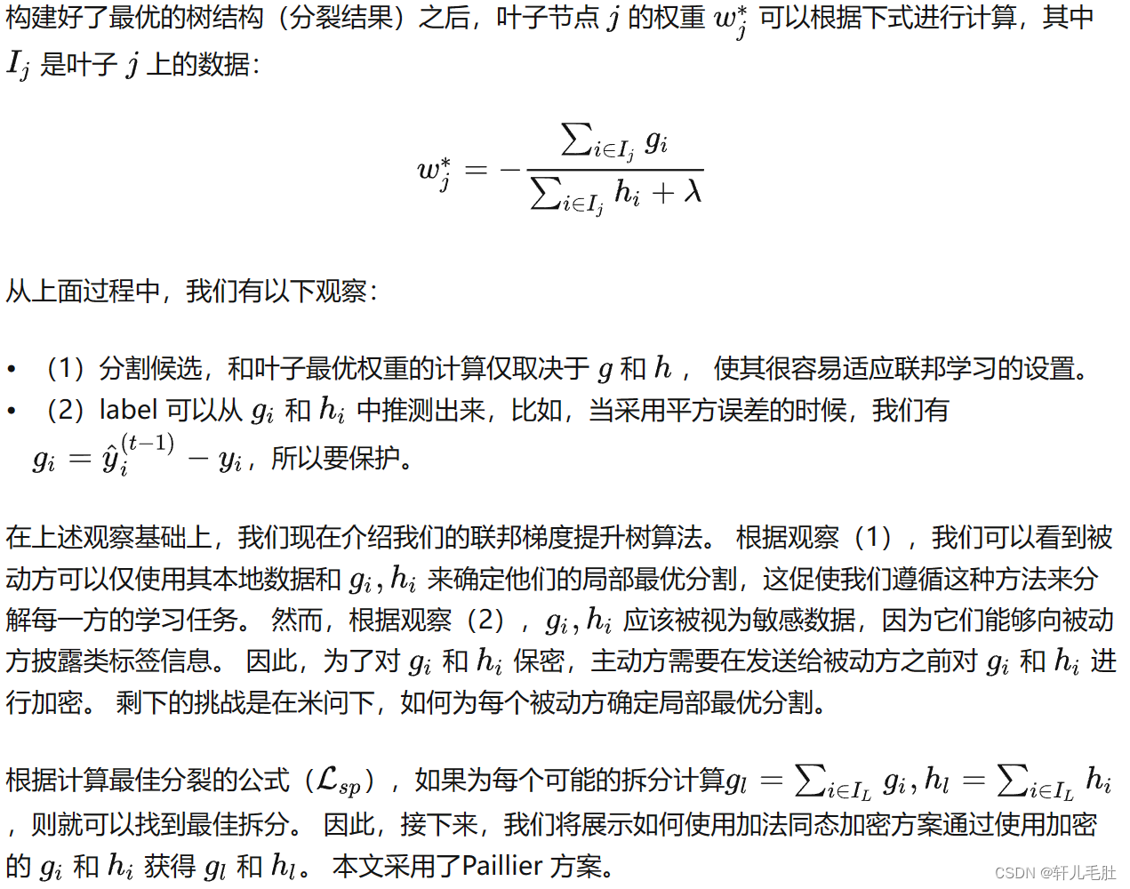 (3)Obj(t)是每一轮优化的目标(loss),经过合并,变形之后,可以看出当前每轮的损失函数只和每个样本的一阶导数和二阶导数的和有联系。换句话说,只要知道每一轮优化的一阶导数和二阶导数就可以计算出loss了(这一点很关键,很重要,关系到后面的同态加密)。