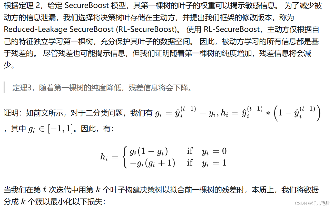 secureBoost提出了completely secureBoost,主要思想是:第一颗树完全由主动方的特征构建,被动方完全不参与,因此,被动方只能接触到经过第一颗树后的残差,相当于做了一个差分隐私。这样就可以保证,主动方的标签基本上不会泄漏(论文中有详细公式证明,而且经过实验验证)。