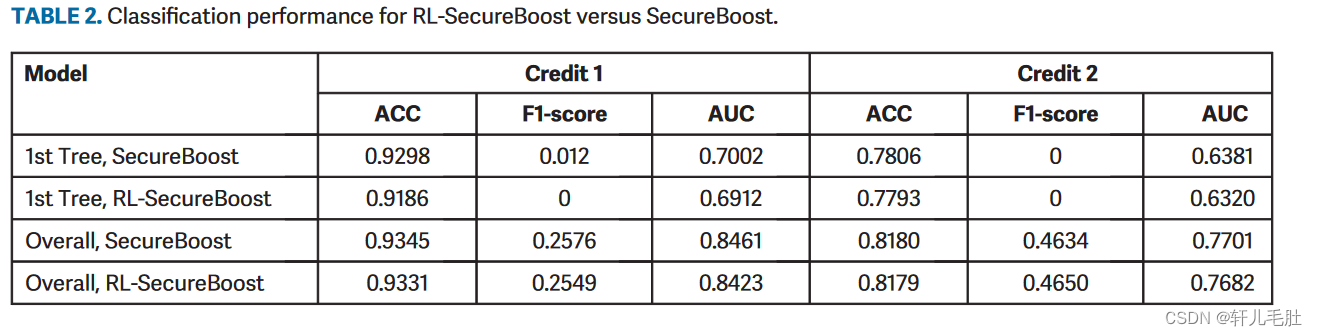 接下来,为了研究 RL-SecureBoost 的预测性能,我们将 RL-SecureBoost 与 SecureBoost 在第一棵树的性能和整体性能方面进行比较。我们考虑常用的指标,包括准确度、ROC 曲线下面积 (AUC) 和 f1-score。结果如表 2 所示。正如观察到的,与 SecureBoost 相比,RL-SecureBoost 在几乎所有情况下的表现都一样好。我们还在 RL-SecureBoost 和 SecureBoost 之间进行了pairwise Wilcoxon signed-rank test。比较结果表明,RL-SecureBoost 与 SecureBoost 一样准确,显着性水平为 0.05。 RL-SecureBoost 的无损特性仍然得到保证。