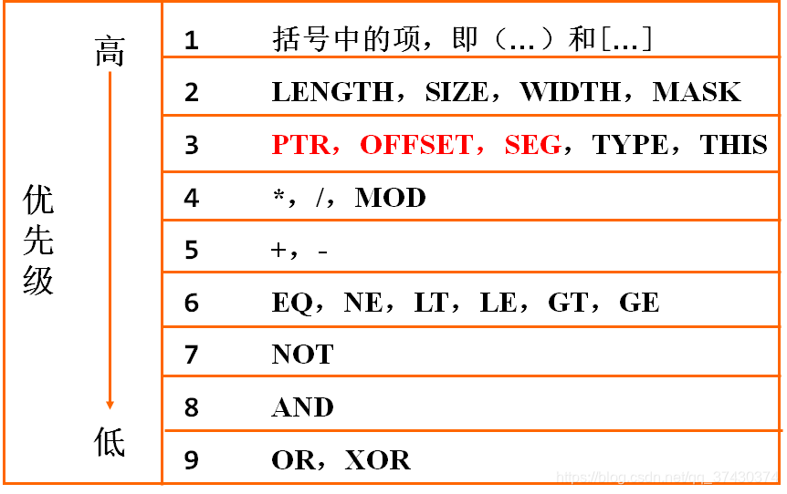 - 求符号名的类型值:MOV AL,TYPE CC;(其中TYPE CC为立即寻址,是CC类型的字节数)