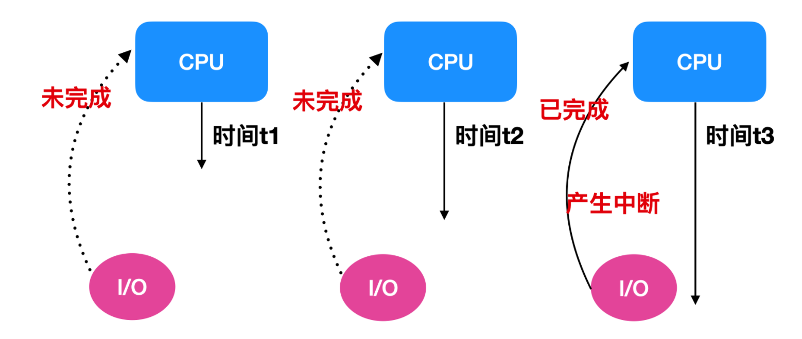 回到正题。大部分物理IO(physical I/O) 是异步的。物理 I/O 中的 CPU 是很聪明的,CPU 传输完成后会转而做其他事情,它和中断心灵相通,等到中断发生后,CPU 才会回到传输这件事情上来。