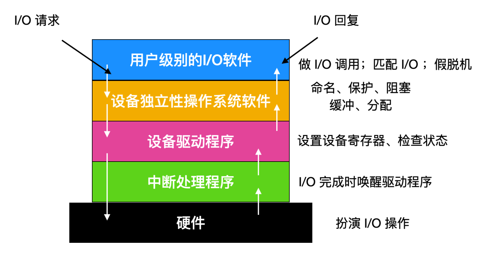 I/O 软件通常组织成四个层次,它们的大致结构如下图所示