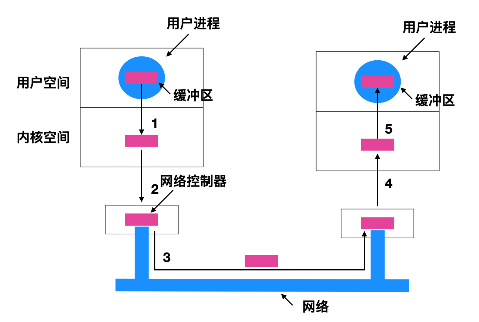 数据经过用户进程 -> 内核空间 -> 网络控制器,这里的网络控制器应该就相当于是 socket 缓冲区,然后发送到网络上,再到接收方的网络控制器 -> 接收方的内核缓冲 -> 接收方的用户缓冲,一条数据包被缓存了太多次,很容易降低性能。