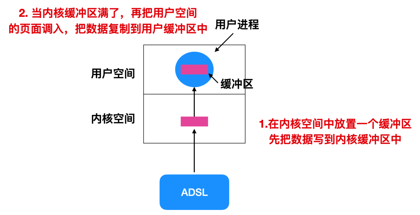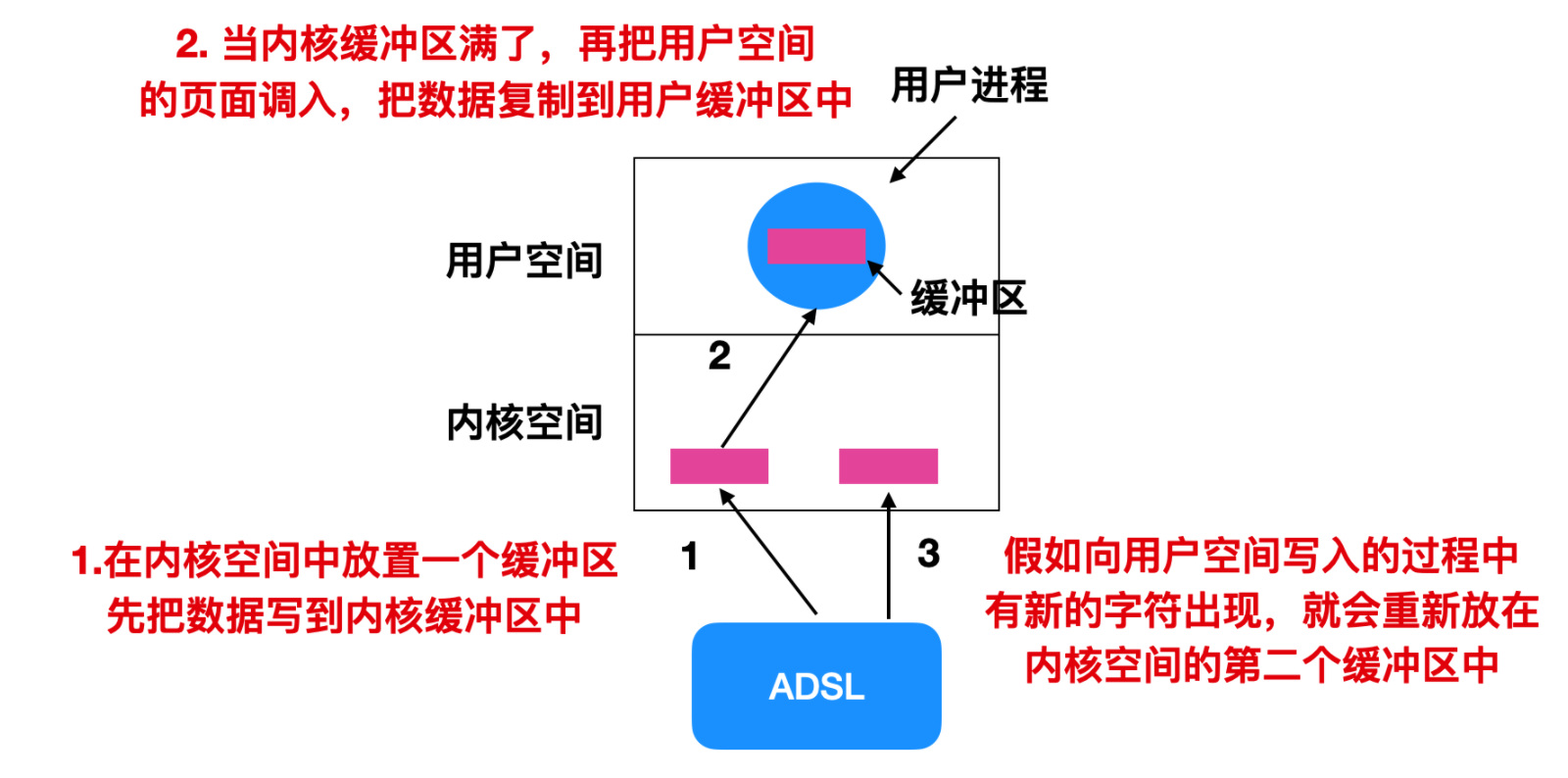 无论是对于块设备还是字符设备来说,缓冲都是一个非常重要的考量标准。下面是从 ADSL(调制解调器) 读取数据的过程,调制解调器是我们用来联网的设备。