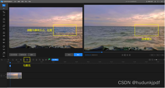 2、视频添加进来后,点击下方的“马赛克”功能,我们可以随意调整马赛克的大小和位置,同时还有效果展示,最后再将视频导出就可以啦。