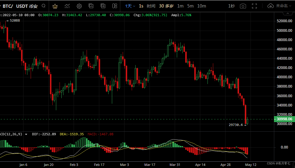 以太走势跟着大饼,大饼跳水,以太也是跟着跳。下方支撑接连被跌破,k线向下跳水至2220附近后开始回弹,完全不知道什么时候才是个底。月k已经跌破关键支撑,走势不太乐观,向上上升空间不大,市面上很多人都在说着抄底时间到,截止到目前为止多头连一个像样的反弹都没有拿什么抄底?牛回?牛已经彻底看不见影子了,这种情况下,不建议抄底,可以短多但是大趋势还是以空头为主。所以稳妥起见,顺势而为,关注2200支撑,如果跌破则继续向下看。当前币价位于30800区域,朋友们认为会跌破去年的519在创新低吗?还是29750就是底部?我认为不是,不管怎样,还是建议“高空”,切勿盲目抄底。5.5美联储加息50基点只是开胃大菜,好戏还在后头!