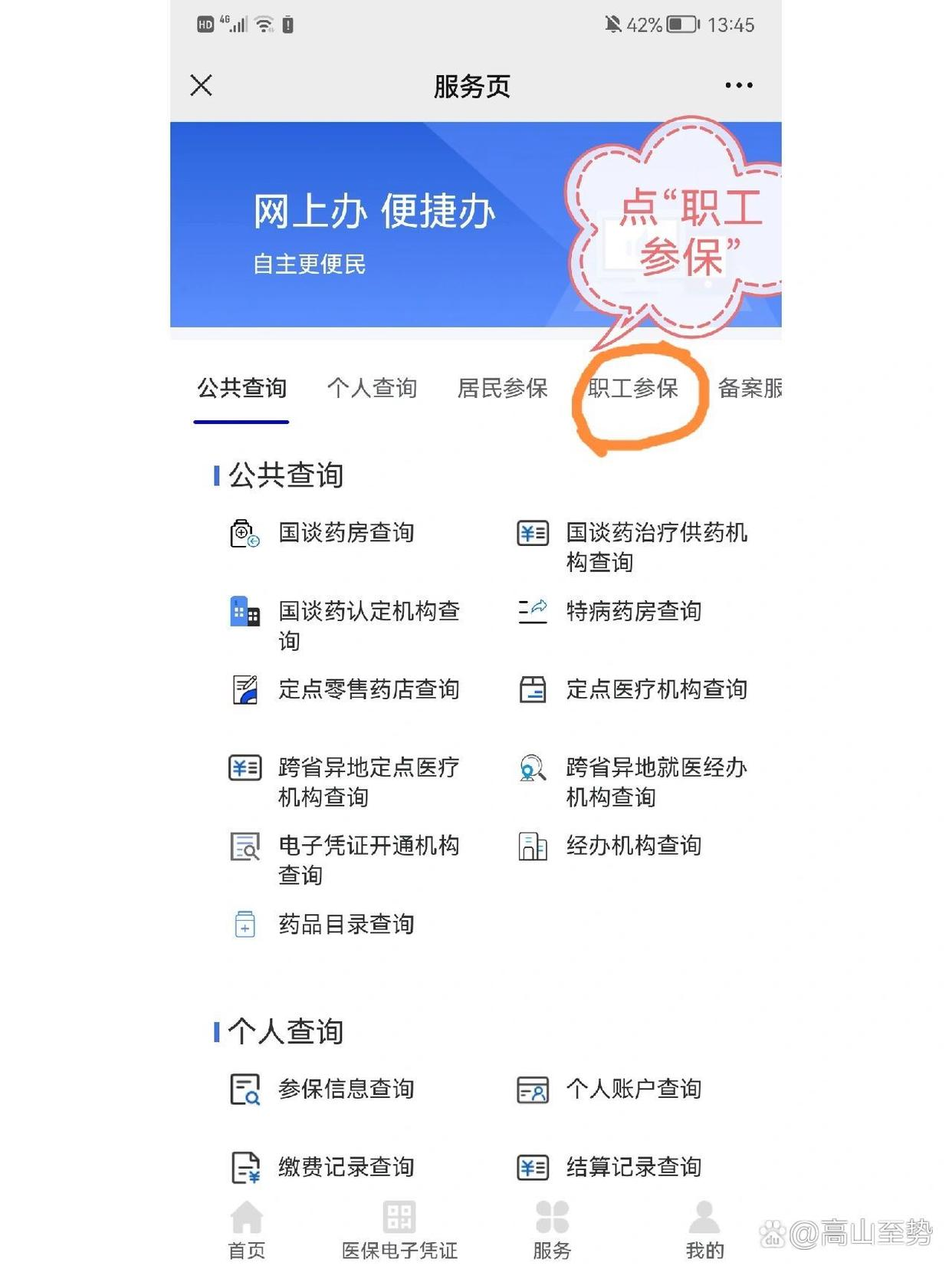 - 关注重庆市医疗保障局公众号,在公众号页面里点击“服务大厅”,在接下来的页面里点击“服务”,在服务业面里有一个“职工参保”,在接下来你就可以找到“以个人身份参加职工医保参保登记”这个选项了。