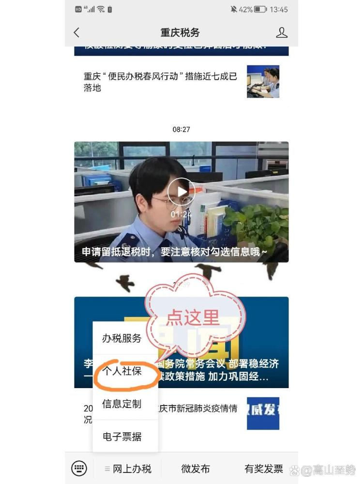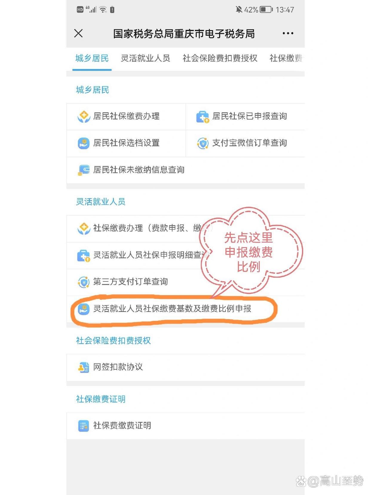 先关注重庆税务的公众号,然后在公众号主页的“网上办税”里点击“个人社保”。进入页面后先申报缴费比例,在“灵活就业人员”那一栏下面点击“灵活就业人员社保缴费基数及缴费比例申报”,点进去之后选择缴费比例,申报完成后退回页面开始缴费。还是在“灵活就业人员”那一栏下面,点击“社保缴费办理”,进入页面后根据要求填写信息完成缴费。(重庆的医保是一次缴一年的,但如果你是年中缴费,按剩下的月份自动计算缴费额度)