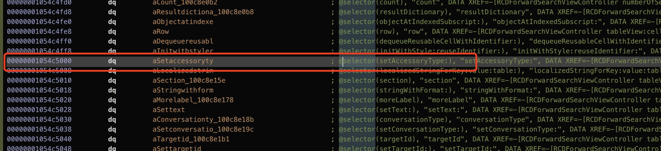开始内存跨页寻址, 定位到对应函数(objectAtIndex)的所处的内存页面首地址, 此处定位到了 @selector(setAccessoryType:) 函数所在内存的地址 #0x1054c5000