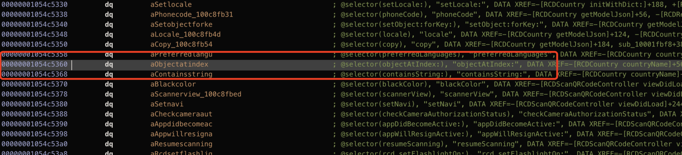 内存页内偏移0x360, 定位到"objectAtIndex:",@selector(objectAtIndex:)函数所在的地址 #0x1054c5360 , 放入x1(即cmd)