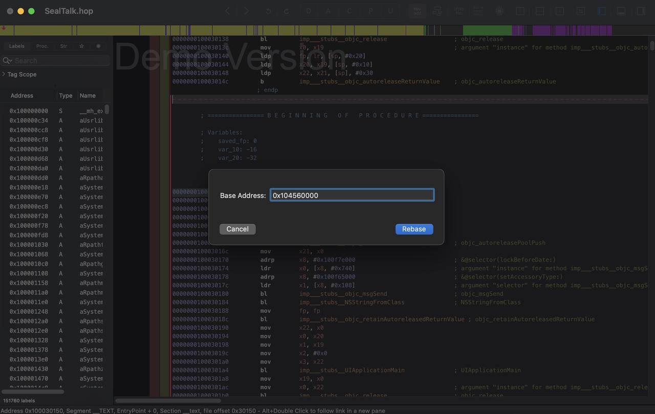 动态库: 动态库是一个链接号的二进制文件, 会被整体载入内存, 而且不能被宿主App吸附. 和静态库不同, 动态库实在app启动的时候载入内存, 此时, 会将动态库的代码段载入到App虚拟内存中, 并且拥有独立的内存空间(动态库的数据段会在宿主App链接时提前做备份), 其基地址有别于宿主程序和其他动态库 所以使用hopper进行反汇编时, 如果是宿主程序, 需要使用宿主程序的基地地址, 相应的, 动态库需要使用动态库的基地址