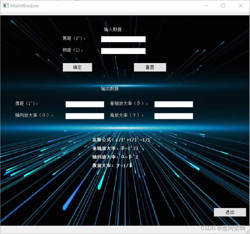 {double jiaoju =ui->lineEdit->text().toDouble();double wuju =ui->lineEdit_2->text().toDouble();double xiangju;xiangju=jiaoju *wuju/(jiaoju+wuju);ui->lineEdit_3->setText(QString::number(xiangju));double chuizhoufangdalv;chuizhoufangdalv=jiaoju/wuju;ui->lineEdit_4->setText(QString::number(chuizhoufangdalv));double zhouxiangfangdalv;zhouxiangfangdalv=chuizhoufangdalv*chuizhoufangdalv;ui->lineEdit_5->setText(QString::number(zhouxiangfangdalv));double jiaofanglv;jiaofanglv=1/chuizhoufangdalv;ui->lineEdit_6->setText(QString::number(jiaofanglv));
