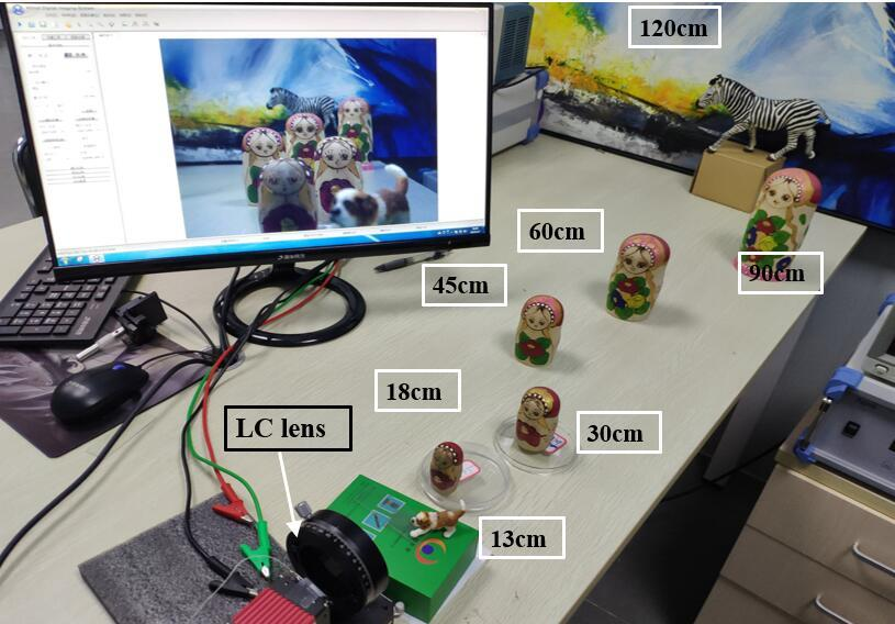 液晶透镜光学成像系统实验装置及摆放场景如图所示。液晶透镜放置在由玻璃透镜和图像传感器组成的相机模组之前作为成像系统的光阑。首先,不加电压使液晶透镜工作在非透镜状态,调节初始对焦面。通过函数发生器改变液晶透镜驱动条件,调节电压信号再由高压放大器输出电压。
