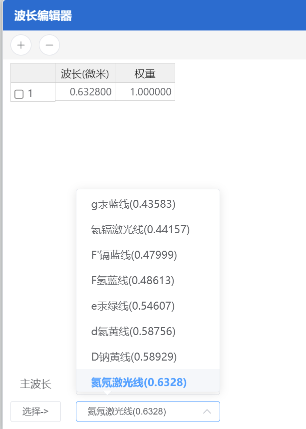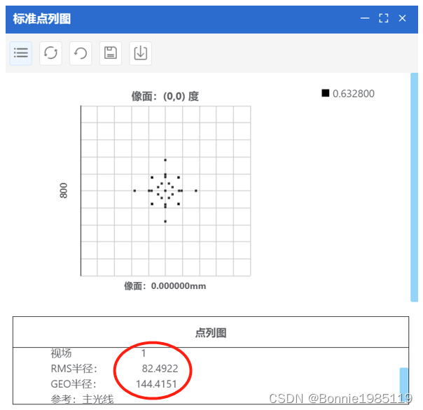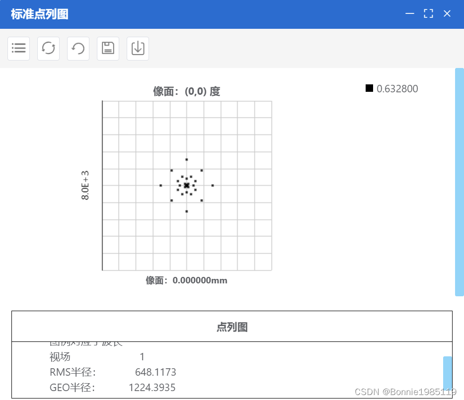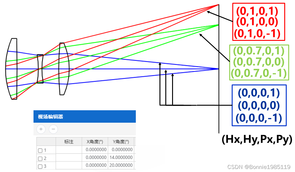 上图中P为轴外物点, R为入瞳中心,PR就是主光线,PA为子午上光线,PB为子午下光线,PC和PD则是对称的弧矢光线。 每条光线都用归一化的视场坐标(Hx,Hy)和归一化的光瞳坐标(Px,Py)确定. 视场设置 半视场角20°,我们选择0,0.707和1视场,分别设置0°,14°和20°  波长设置 选择He-Ne激光器波长0.6328um  系统设置 孔径30mm,在系统孔径里面作如下设置