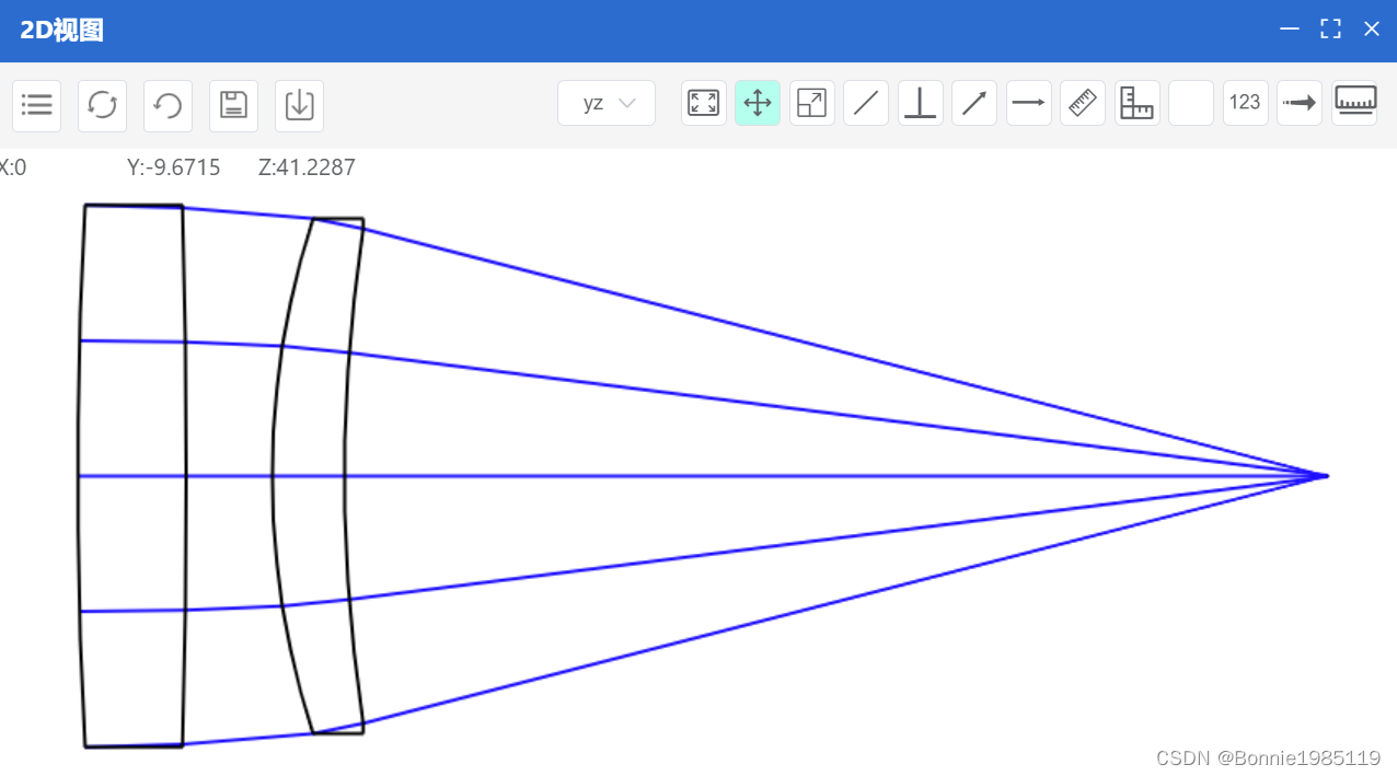 | 设计要求 物距𝑙=∞,视场角𝜔=0^°;焦距𝑓^′=60mm;相对孔径𝐷/𝑓^′ =1/2; 工作波长λ=0.6328μm。 此镜头只需要校正轴上点球差。 RMS弥散圆直径小于0.02mm。 镜头结构尽量简单,争取用两块镜片达到要求。 主光线和上下光线