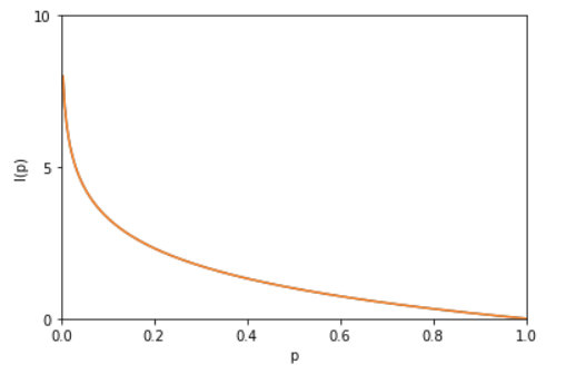 因为两个事件是独立不相关的,因此 p ( x , y ) = p ( x ) p ( y ) p(x,y)=p(x)p(y) p(x,y)=p(x)p(y)。根据这两个关系,很容易看出 I ( x ) I(x) I(x)一定与 p ( x ) p(x) p(x)的对数有关(因为对数的运算法则是 log a ( m n ) = log a m + log a n \log_a{(mn)}=\log_a{m}+\log_a{n} loga(mn)=logam+logan)。因此,我们有 I ( x ) = − log p ( x ) I(x)=−\log{p(x)} I(x)=−logp(x),其中负号是用来保证信息量是正数或者零。而 log函数基的选择是任意的(信息论中基常常选择为2,因此信息的单位为比特bits;而机器学习中基常常选择为自然常数,因此单位常常被称为奈特nats)。 I ( x ) I(x) I(x)也被称为随机变量 x x x 的自信息 (self-information),描述的是随机变量的某个事件发生所带来的信息量。如图: