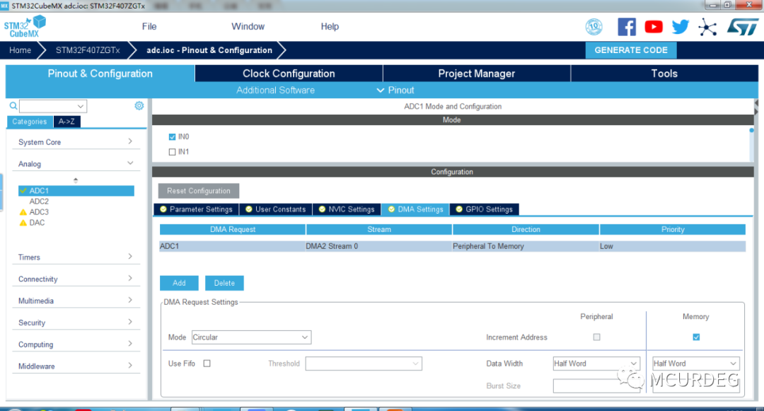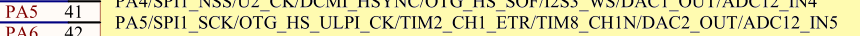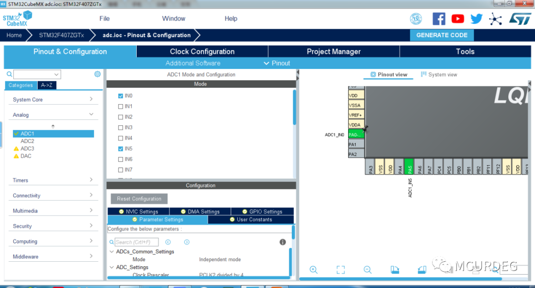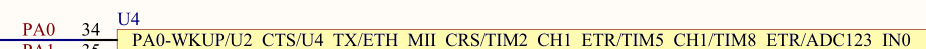 MCU的引脚PA0:ADC1的输入通道0,引脚PA5:ADC1的输入通道5。