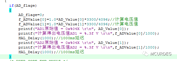 在主函数中判断标志位,当转换完成时打印采集的电压值,并将标志位置0