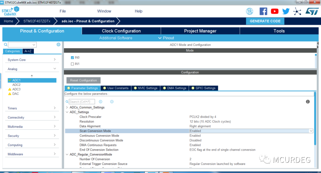 前面讲了如何使用CubeMX配置MCU的ADC,在实际中往往会使用多个通道采集输入的模拟量,这篇文章讲解双通道ADC的采集如何配置。