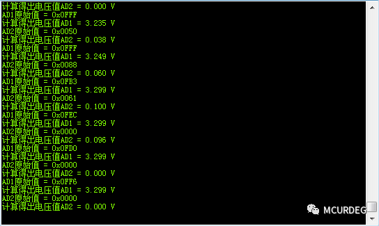 当通道5(字符AD1)接0V,通道0(字符AD2)接3.3V时,打印结果如下图